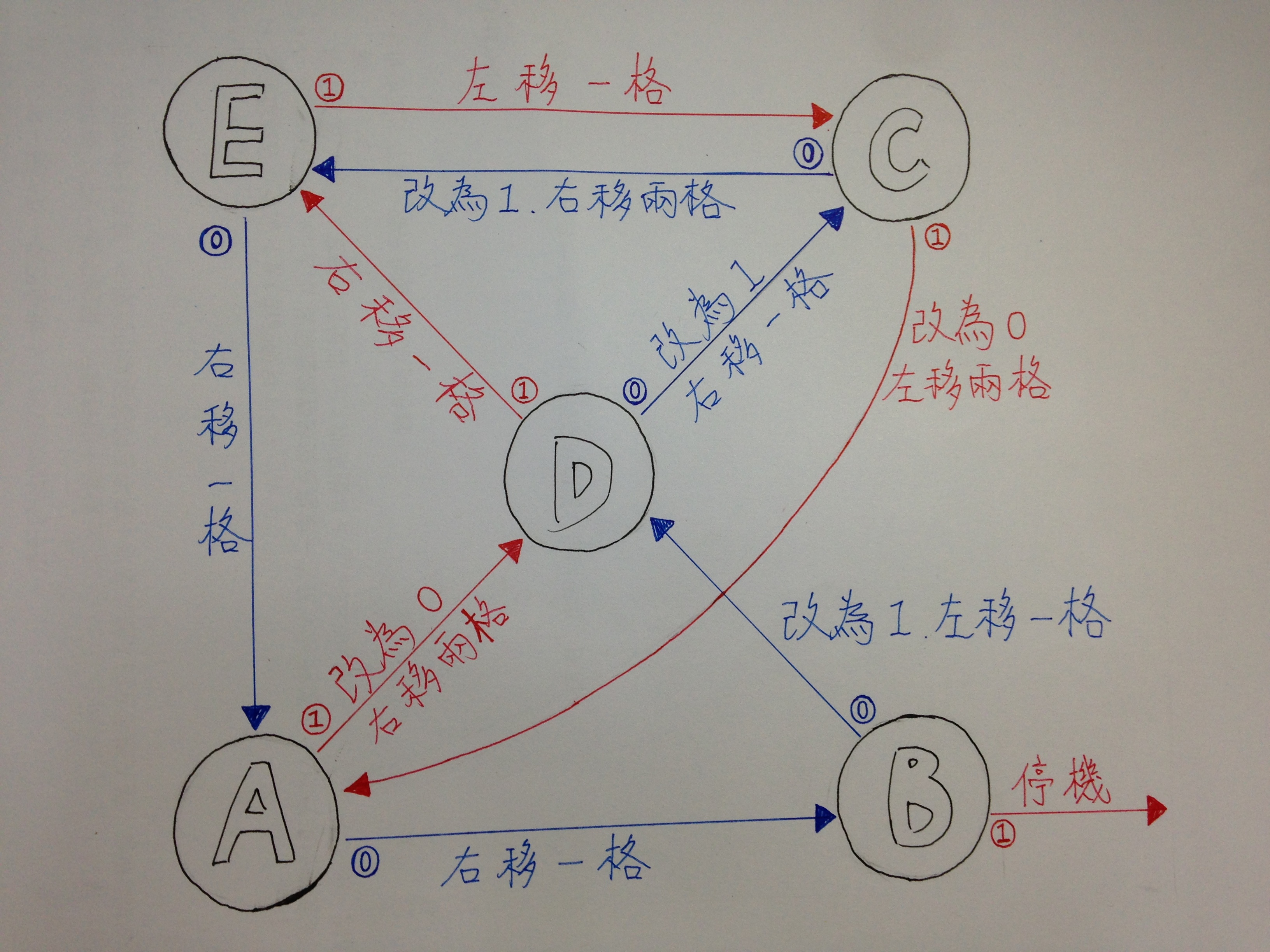初始: ( 111001 ) 讀寫頭在$0$號位置讀到$1$,將$1$改為$0$,狀態變為$D$,移到$2$號位置 ( 011001 ) 讀寫頭在$2$號位置讀到$1$,狀態變為$E$,移到$3$號位置 ( 011001 ) 讀寫頭在$3$號位置讀到$0$,狀態變為$A$,移到$4$號位置 ( 011001 ) 讀寫頭在$4$號位置讀到$0$,狀態變為$B$,移到$5$號位置 ( 011001 ) 讀寫頭在$5$號位置讀到$1$,停機 |